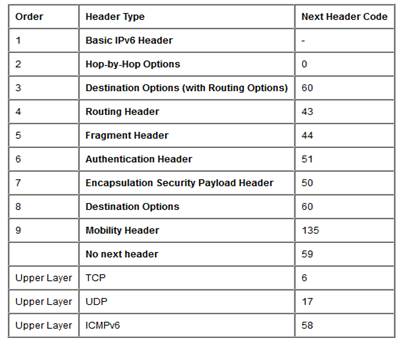 RFC2460’ta IPv6 paketine eklenebilecek ek başlıklar ve tavsiye edilen ekleme sıraları aşağıda Şema-3’deki gibi belirtilmiştir :