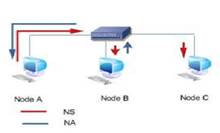 Örneğin aşağıdaki resimde MAC öğrenmek için normal seyrinde işleyen NS ve NA paketlerinin alışverişini görebiliriz. Node A üzerinden Node B’ye veri iletiminin sağlanabilmesi için A’nın ICMPv6 NS paketini multicast adrese iletmesi, bu multicast adres üzerinden dinleme yapan B’nin ise paketin kendisine geldiğini anlayarak A’ya “Solicited” bayrağı aktif olan ICMPv6 NA paketini dönmesi gerekmektedir.